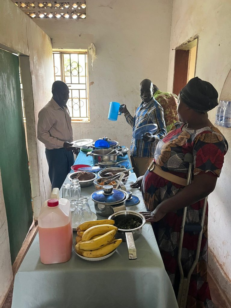 Um ihrer Freude Ausdruck zu verleihen, haben die Mitarbeitenden und Unterstützer des Orthopädischen Zentrums zum Mittagessen eingeladen. Es gibt traditionelle ugandische Kost, liebevoll zubereitet auch durch Mithilfe einiger Patientinnen, die ihren „Retter“, dem orthopädischen Team, das ihnen die Rückkehr in ein nahezu normales Leben ermöglicht hat, ihren Dank ausdrücken wollen. Stolz präsentiert eine Patientin dem Team ihren kleinen keine 3 Monate alten Sohn. Er wird sofort zum Maskottchen des Zentrums ernannt!